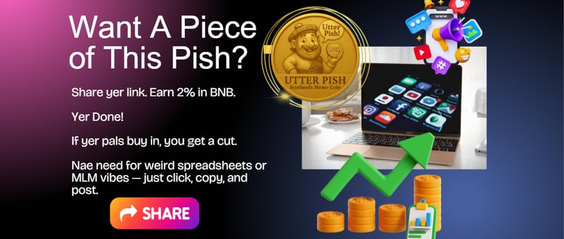 Let me be honest. Before this week, I thought MetaMask was a nightclub in Ibiza and that BNB was a new Scottish Party. 🫠. I own a few coins but only on coinbase - the other wallets seemed like another world. Crypto? Charts? DEXs? It all sounded like financial witchcraft invented by sweaty men in basements. I hold some meme coins, & thought I want to create one: A meme coin called Utter Pish. Why Utter Pish? Because: It’s Scottish It’s got a laugh behind it. And it doesn’t take itself too seriously I mean, come on-it literally says “Retire yer da” on the front page. So How Do You Even Buy a “Wee Shitcoin”? Thats not on Coinbase? I had no idea either. But the beauty of Utter Pish is: You can ask daft questions Nobody shames you The community’s full of sound folk (some even ken what they’re talking about) Let’s be honest - most crypto chats are full of bots, bros shouting “100x,” or folk trying to flog you some dodgy NFT of a hedgehog in sunglasses. We wanted something different. A place where: You can ask daft questions without feeling daft You can learn how to buy your first coin without feeling judged You can share your PISH (and your wins) with a sound bunch of people Whether you’re brand new or been dabbling for a bit — come be one of the originals who helps build a Scottish crypto community that actually has a laugh. _______________ Fancy It? You don’t need to be a tech wizard. Just bring a bit of BNB and a sense of humour. Here’s what to do 👇 Join the Telegram 👉 @UPISH_Official Say hello - we’ll welcome you in Buy some $UPISH Flex your badge and share your own crypto chaos _________ Final Thoughts Crypto doesn’t need to be serious, scary, or full of shite. But it can be funny, human, and built by folk who care. That’s what we’re doing with Utter Pish. Come help us stir the pot 💨